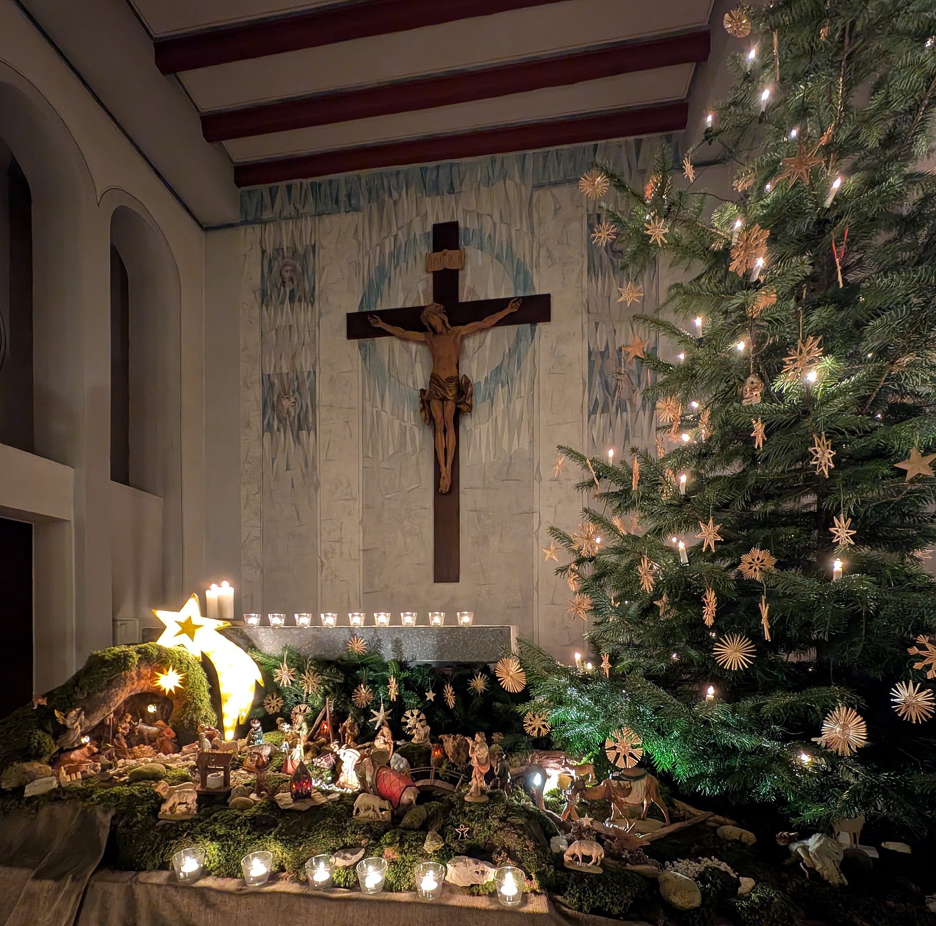 Die Krippe wurde durch ein Erntedankfest 1996 im Rohbau des Bürgerhauses finanziert. Lagerfeuer, Schäferhütte, Fuchs und Samtbespannung wurden gespendet.