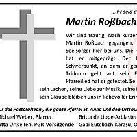 Pfarrei St. Anna Herschbach Abschied von Martin Roßbach Trauer und Hoffnung Pfarrei St. Anna Abschied von Martin Roßbach Wir müssen Abschied nehmen von Gemeindereferent Martin Roßbach, der die Pfarrei