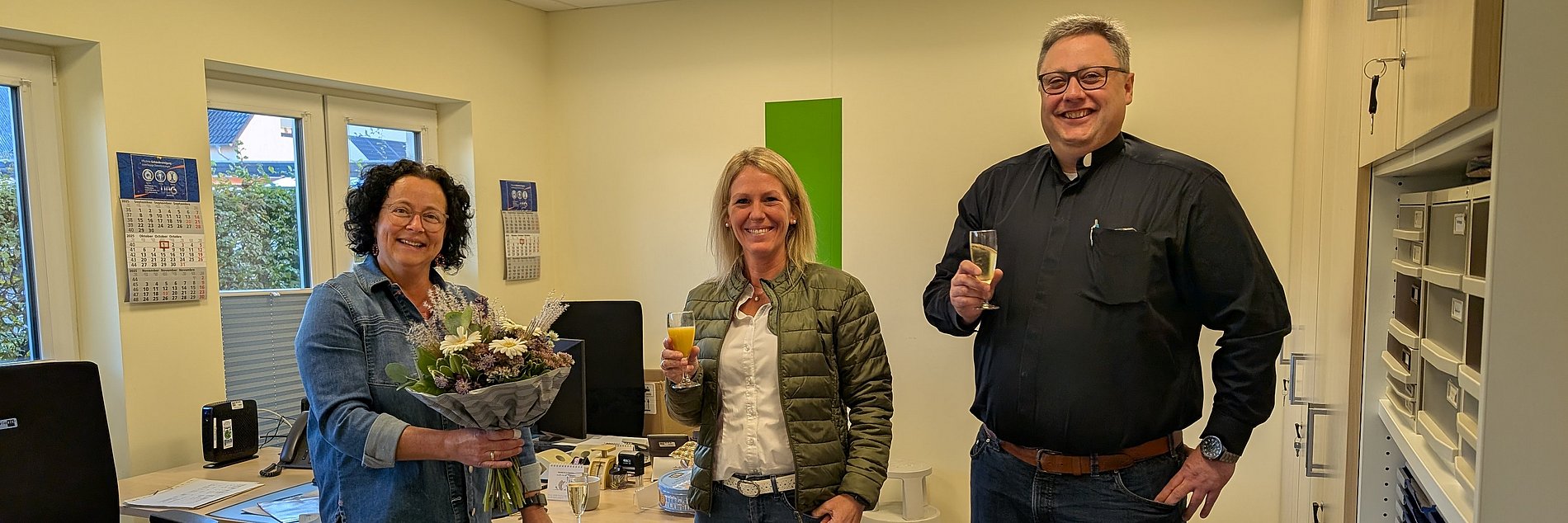 Vor genau einer Woche durften wir im Pfarrbüro Helga Deichmann als neue Mitarbeiterin in unserer Pfarrei St. Anna begrüßen. Wir freuen uns, dass sie unser Verwaltungsteam ab sofort unterstützt und wünschen ihr weiter einen guten Start - und viele gute Begegnungen mit euch allen. Foto von links nach rechts: Pfarrsekretärin Helga Deichmann, Verwaltungsleitung Eva Boger und Pfarrer Michael Weber