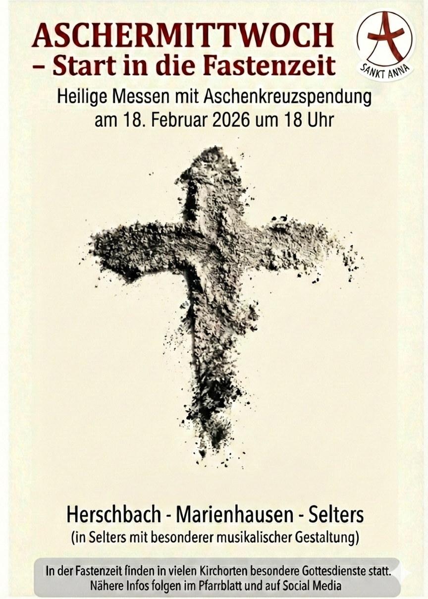 Nach den karnevalistischen Tagen starten wir gern gemeinsam in die Fastenzeit. In diesem Jahr feiern wir die Heilige Messe mit Aschenkreuzspendung an Aschermittwoch (18.02.26, 18.00 Uhr) in Herschbach, Marienhausen und Selters - in Selters mit besonderer musikalischer Gestaltung. Herzliche Einladung!
