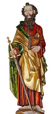 Paulus von Tarsus (lateinisch Paulus; † um 64, vermutlich in Rom) war nach dem Neuen Testament (NT) ein erfolgreicher Missionar des Urchristentums und einer der ersten Theologen der Christentumsgeschichte. Als griechisch gebildeter Jude und gesetzestreuer Pharisäer mit römischem Bürgerrecht verfolgte Paulus zunächst die Anhänger Jesu von Nazareth, dem er in der Zeit seines Wirkens nie begegnet war. Doch seit seiner Bekehrung verstand er sich als von Gott berufener Apostel des Evangeliums für die Völker. Als solcher verkündete er vor allem Nichtjuden den auferstandenen Jesus Christus. Dazu bereiste er den östlichen Mittelmeerraum und gründete dort einige christliche Gemeinden. Durch seine Briefe blieb er mit ihnen in Kontakt. Paulus starb der Überlieferung nach zwischen 64 und 67 n. Chr. Danach erlitt er den Märtyrertod in der Nähe von Rom. Als römischer Bürger soll er nicht gekreuzigt, sondern vor den Toren Roms bei den "Tre Fontane" geköpft worden sein. Die "Tre fontane" (3 Quellen) seien entsprungen als der Kopf des Heiligen bei der Hinrichtung dreimal auf die Erde aufsprang. Der Heilige wird daher auch oftmals mit einem Schwert dargestellt.